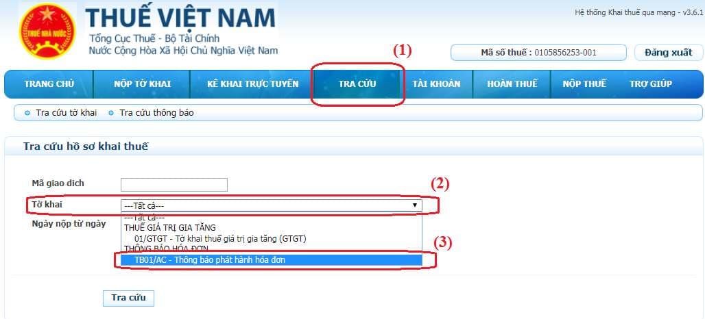 + Sau khi các bạn đã nộp xong Thông báo phát hành hóa đơn trên nhantokhai.gdt.gov.vn các bạn vào mục: Tra cứu / TB01/AC – Thông báo phát hành hóa đơn: