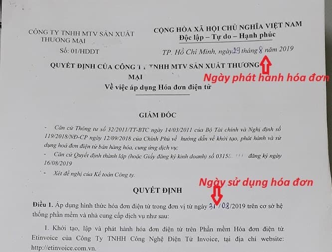 Lưu ý: Ngày bắt đầu sử dụng sau ít nhất 2 ngày kể từ ngày Thông báo phát hành hoá đơn điện tử.