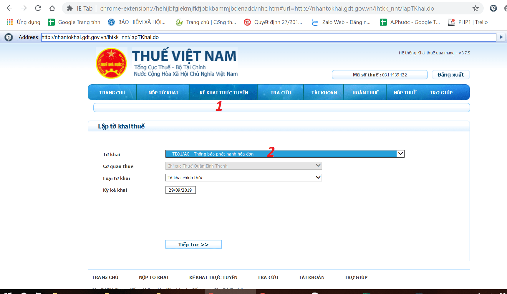 – Sau đó Tích chọn “Thông báo phát hành hóa đơn”/ Tiếp tục