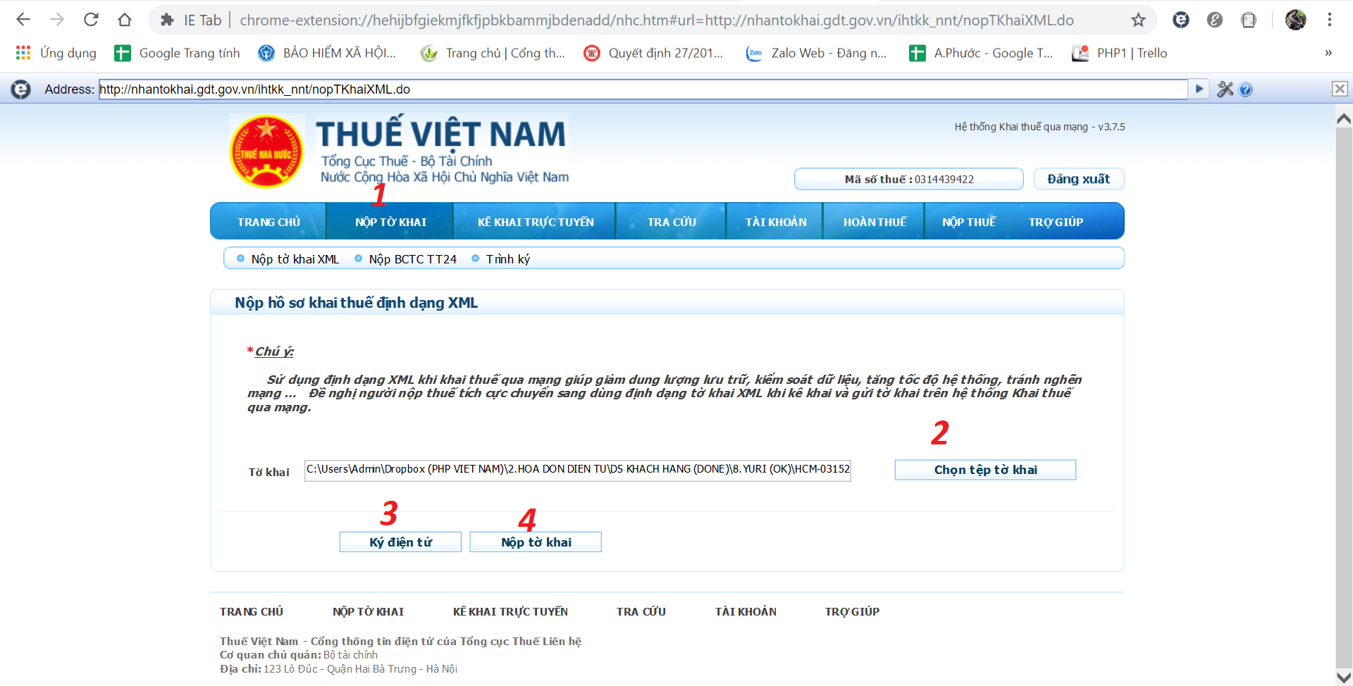 Sau khi đã đăng ký loại tờ khaixong các bạn Nộp Thông báo phát hành hóa đơn. Vào mục “Nộp tờ khai”/ Tải lên fife thông báo “XML”