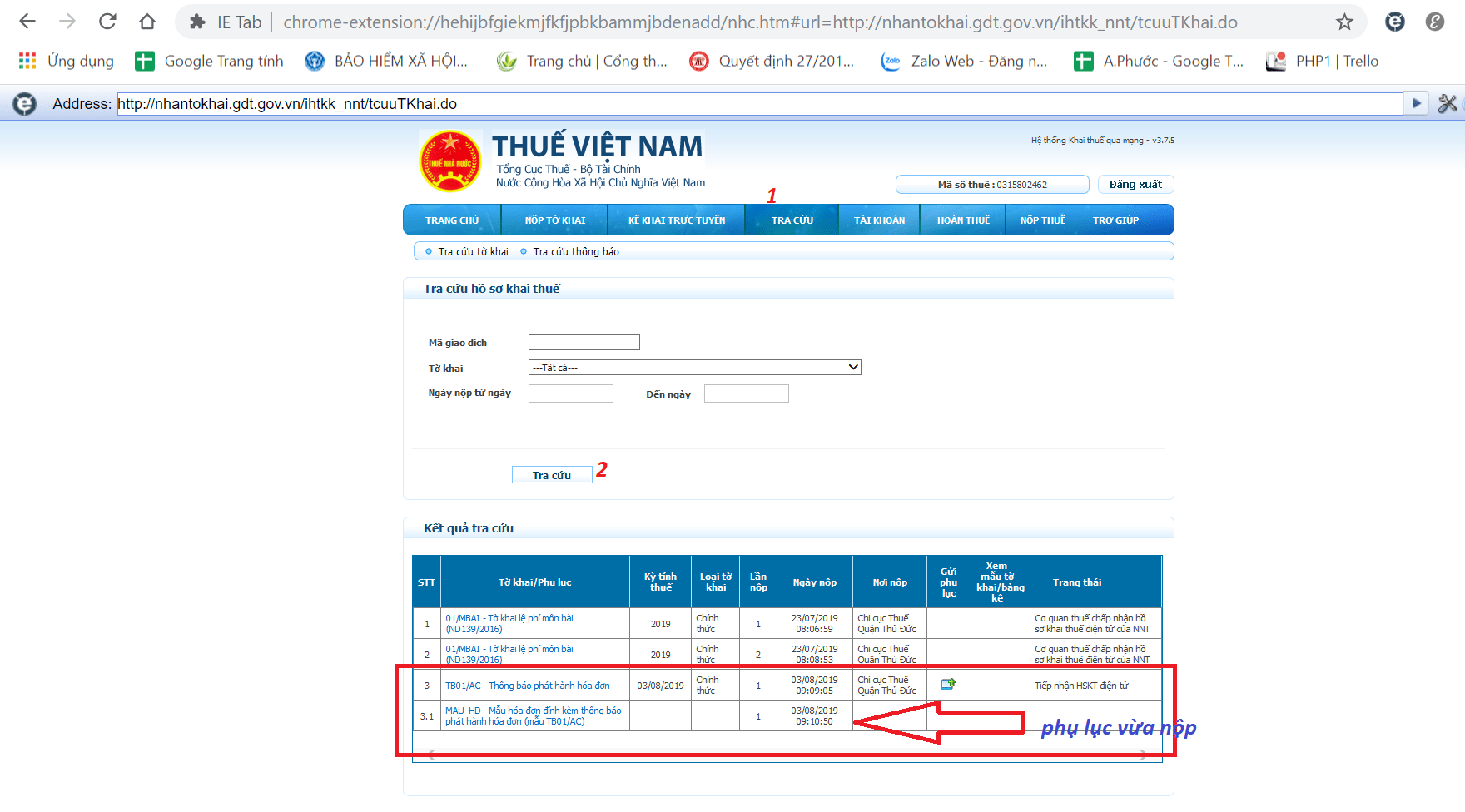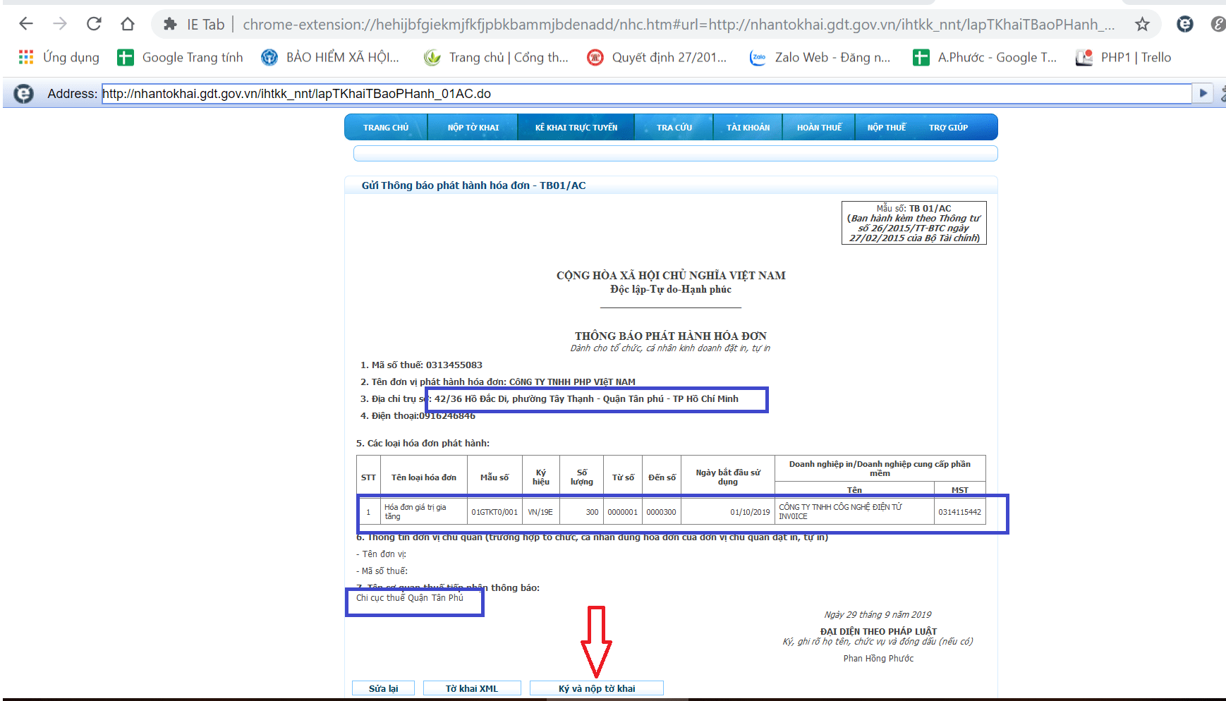 Sau khi nộp xong ta vào tra cứu để kiểm tra. Khi tháy chỗ phát hành hóa đơn như hình bên dưới là đã thông báo thành công.